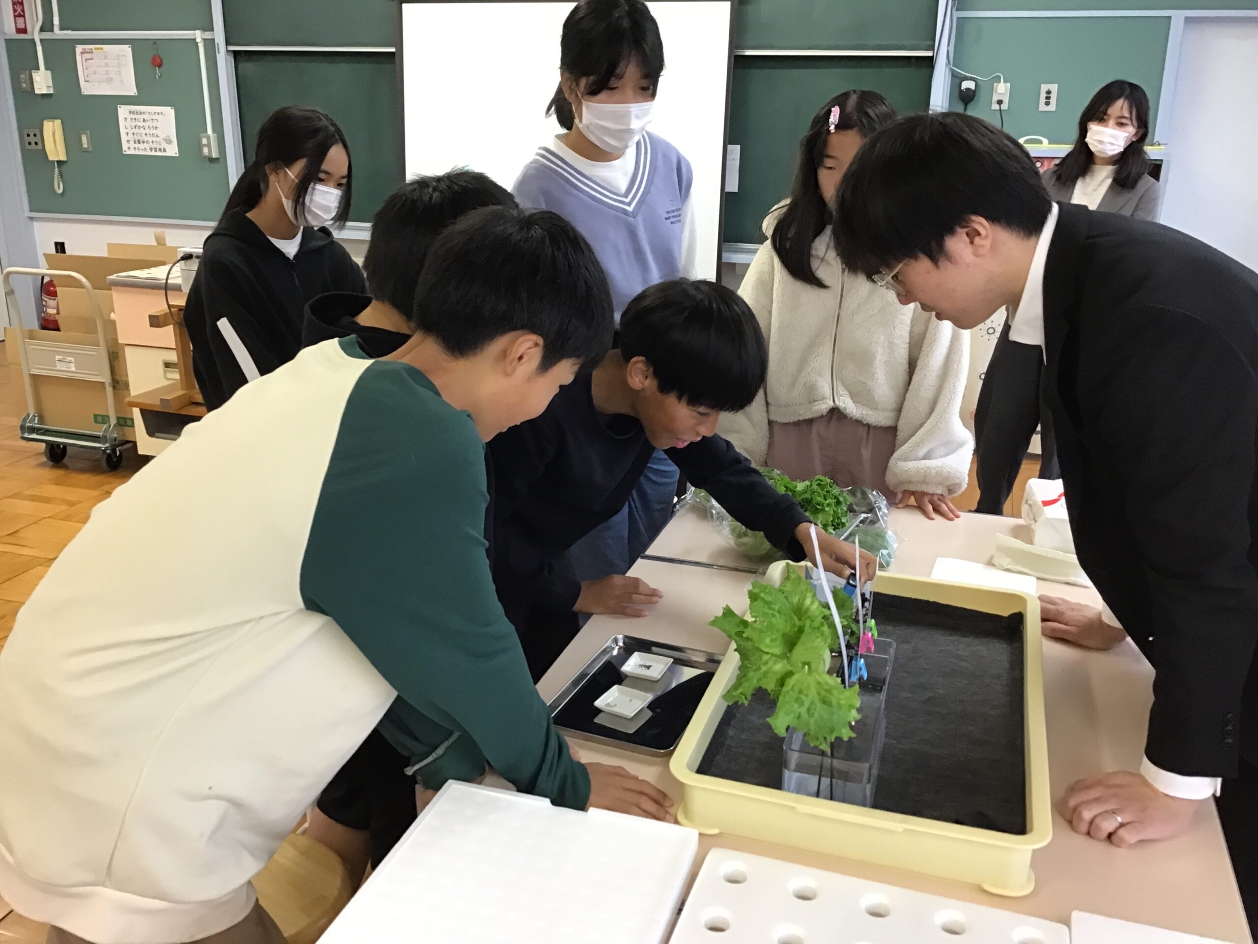 工場の中で野菜が育つことに驚き、関心を持つ生徒。とても目を輝かせて、しっかり授業を聞いてもらえたのが強く印象に残っています。